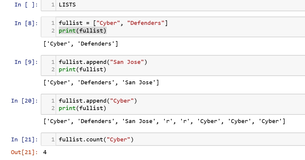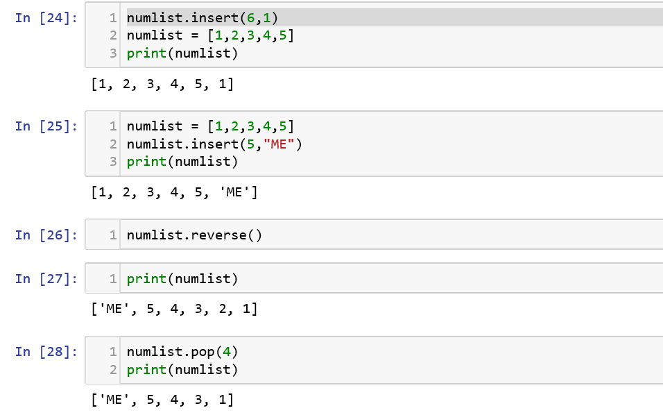 When we type the name of the list with a ‘.’ in the end and press the TAB key, we will be able to see the various methods that can be used on the list which includes append(), count(), reverse(), extend(), insert(), pop(), remove() and sort(). Let us see a few of them and their functioning through the code sample: