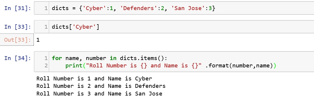 Dictionaries are made of key-value pairs, where key is used to identify the item and the value holds the value of the item. Let us see how to declare a dictionary say “dicts” and try to iterate through each item using the items() function.