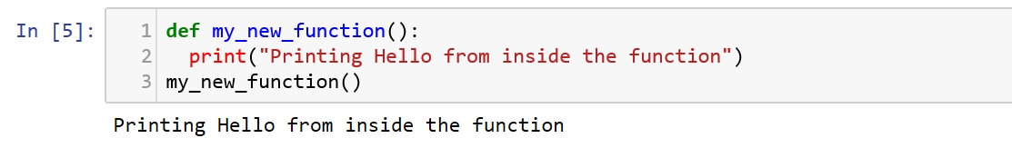 In Python, a function declaration begins with the keyword “def” for defining the function and ends with “:” marking the end of the declaration. In the example, we declare a function called my_new_function().