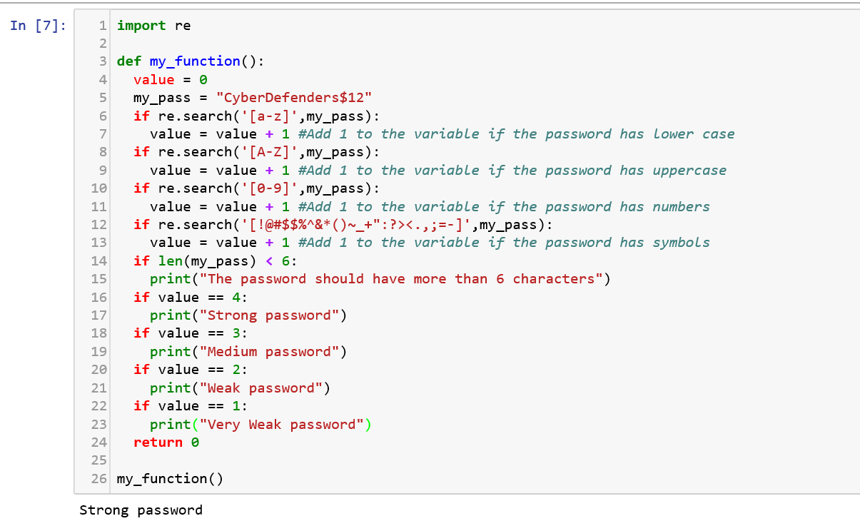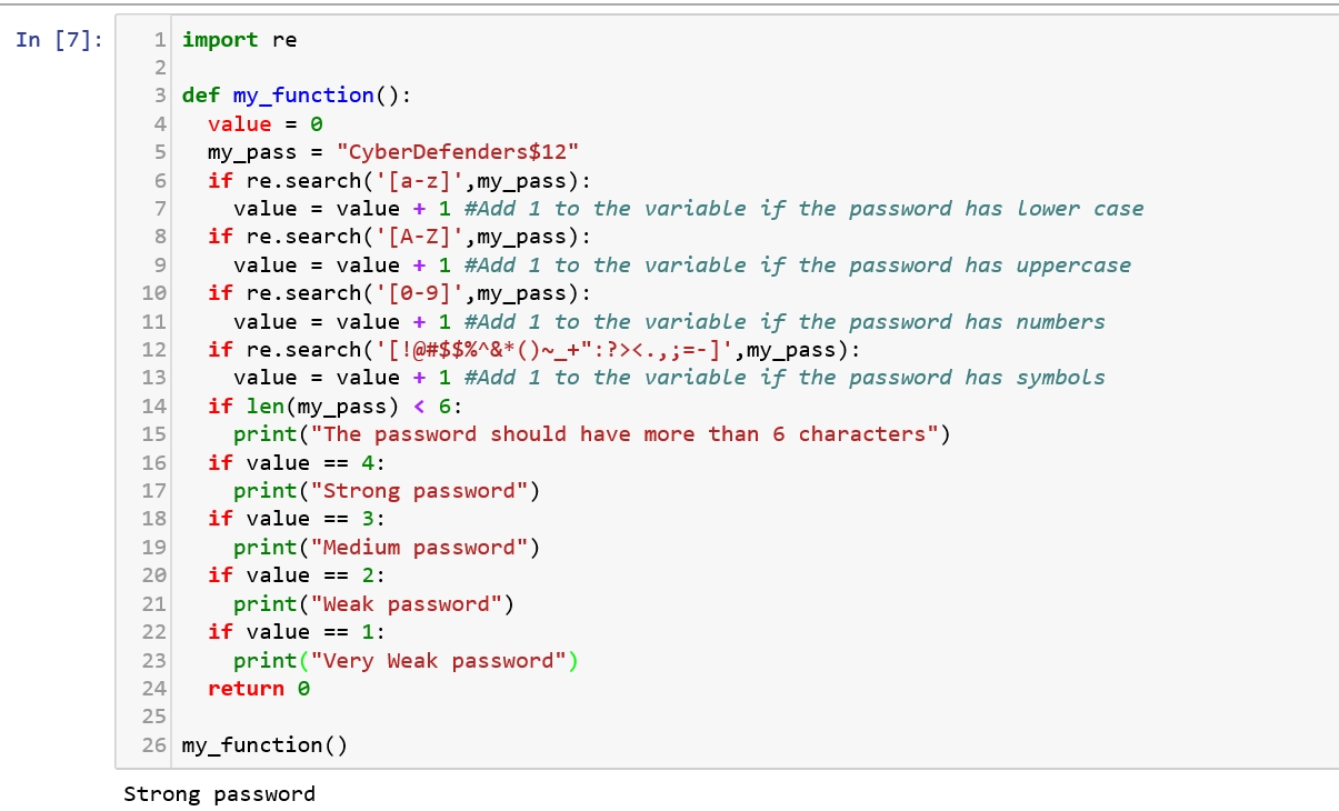 As you can see, re.search() function is used to search for matching strings, which is then compared with the input string my_pass. The other functions that are commonly used with regex are compile(), findall() and match().