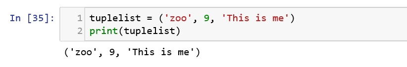 Tuples look similar to lists except for the declaration in “( )” instead of “[ ]”. They are used to hold together objects that are immutable, in simple terms, the values cannot be modified.