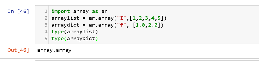 In Python, arrays are not so popular as lists when compared to their use in other programming languages. The prime difference between them is that all the elements in an array need to be of the same datatype. Arrays are declared using the array module, which needs to be imported before initializing them. The data type of the array has to be specified during the array creation.![]()