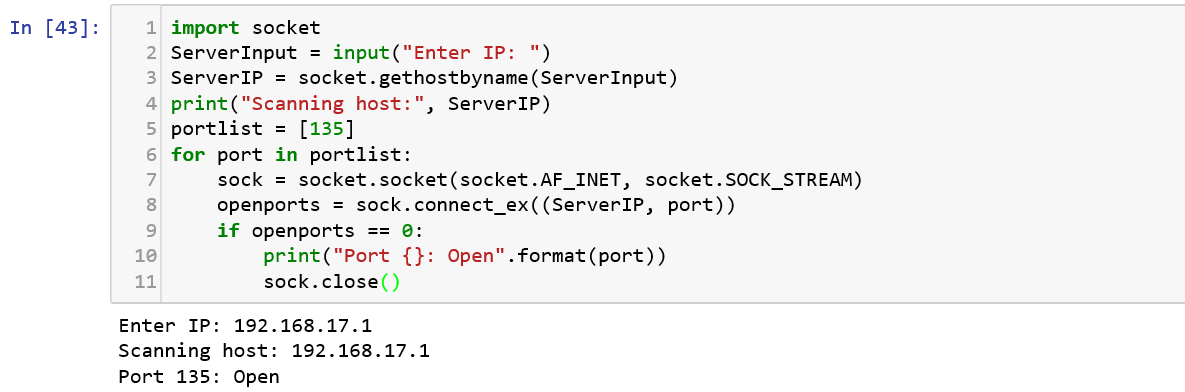 Nmap is an open source utility used for network discovery. Nmap uses raw IP packets to determine what hosts are available on the network, what services (application name and version) those hosts are offering, what operating systems (and OS versions) they are running, what type of packet filters/ firewalls are in use, and more. Let us see a simple implementation yet one of the most useful recon tools — Port Scanner. We implement what the nmap command does, using the following code in Python.
