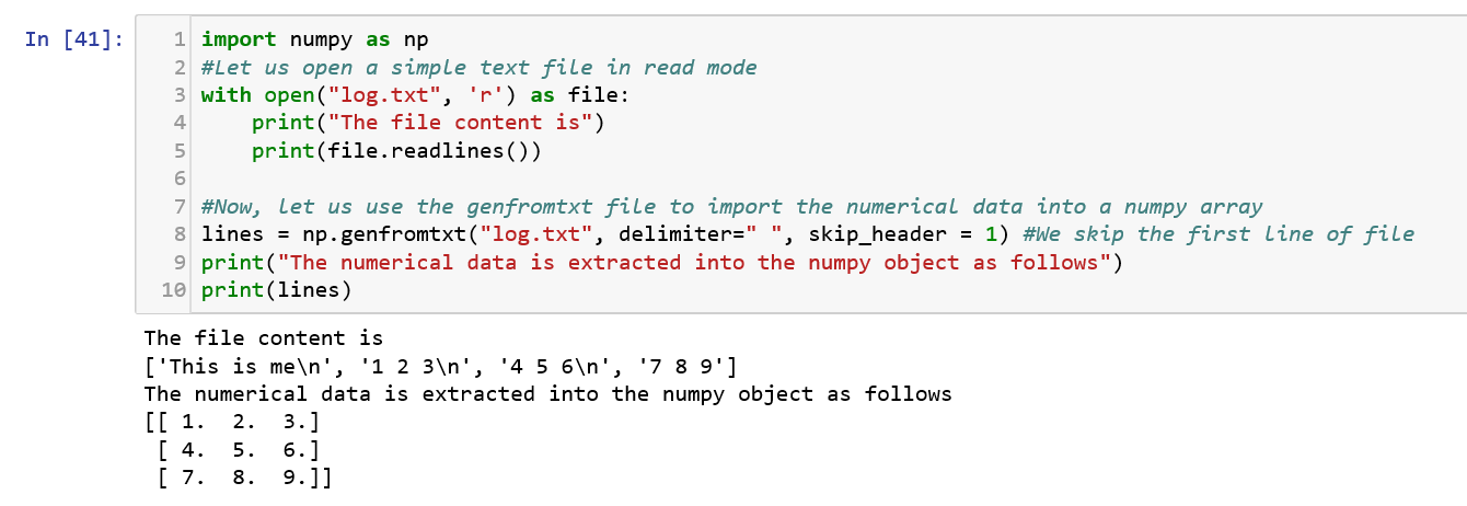 As you can see in the above example, NumPy facilitates reading the numerical data from a file into an array which is the first step when trying to perform data analysis.