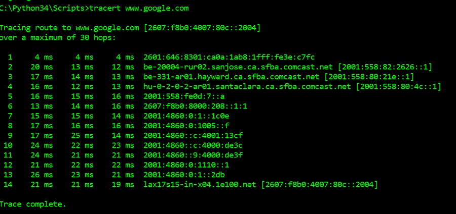 In this example, I am trying to trace the route to www.wikipedia.org and by default it goes upto displaying the details of 30 hops. You can see the time taken to respond and the host network information as the output from the command. Now, that we understand what needs to be done, let us jump to our python implementation.![]()