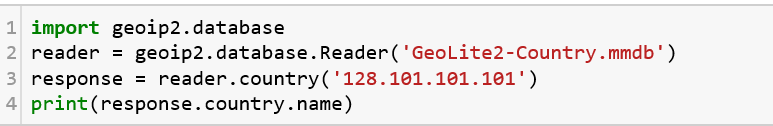 Now, let us write a very simple piece of code to read from the database that is saved in the same directory as the code file. We give a sample input here of 128.101.101.101 to see if it returns the location of the IP.